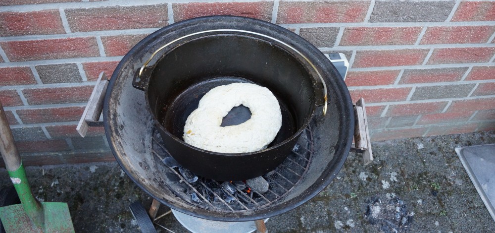 Nachdem wir den Dutch Oven also ausgepackt, begutachtet und wir im Grill unsere Kohlen platziert haben, haben wir den kalten Dutch Oven inklusive unseres Hefeteigs auf die Kohlen gestellt.
