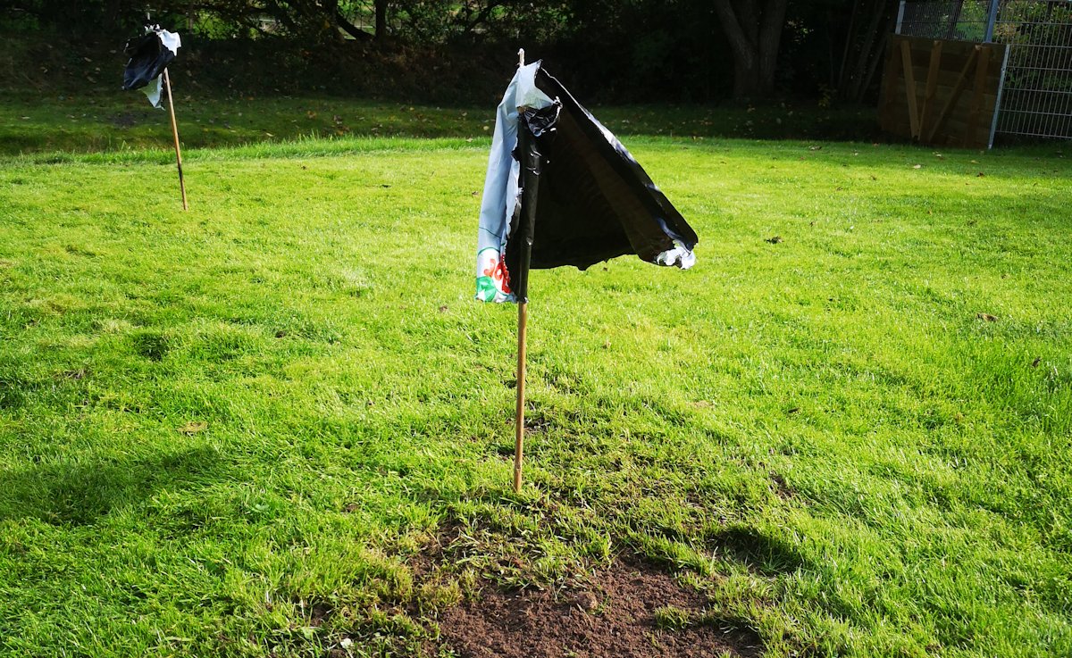 Hier kann die Grasnarbe angehoben und später wieder draufgelegt werden. Alternativ kann der Rasen ganz kurz gemäht, das Netz verlegt, mit Erde angefüllt und der Rasen neu ausgesät werden. Das Netz ist ausreichend grobmaschig, dass der Rasen problemlos durchwachsen kann. Wichtig ist, dass das Netz ausreichend mit Erdnägeln befestigt wird. Beim Einsatz von zu wenigen Haltepunkten kann der Maulwurf dies unter Umständen hochdrücken. Muss das Netz angesetzt werden, sollte man dies etwas überlappen und mit Erdspießen befestigen.